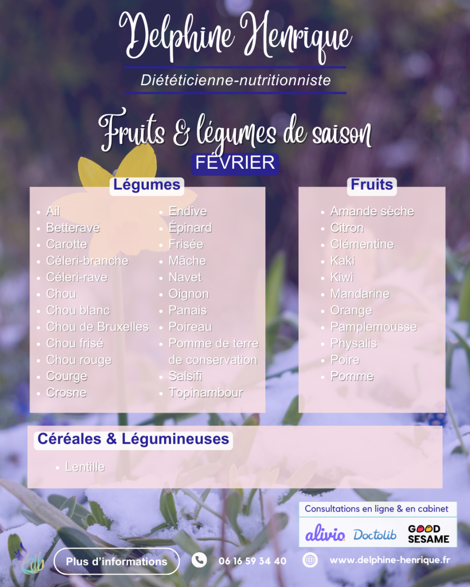 En février, l’hiver est bien installé… et notre alimentation a un rôle clé pour soutenir l’énergie et l’immunité ❄️Les fruits et légumes de saison sont naturellement riches en fibres, vitamines et minéraux, essentiels à cette période de l’année.👉🏼 Manger de saison permet de :• Renforcer les défenses naturelles• Améliorer la digestion• Varier son alimentation simplement• Respecter le rythme du corpsUne question ? Contactez-moi ! 🌿