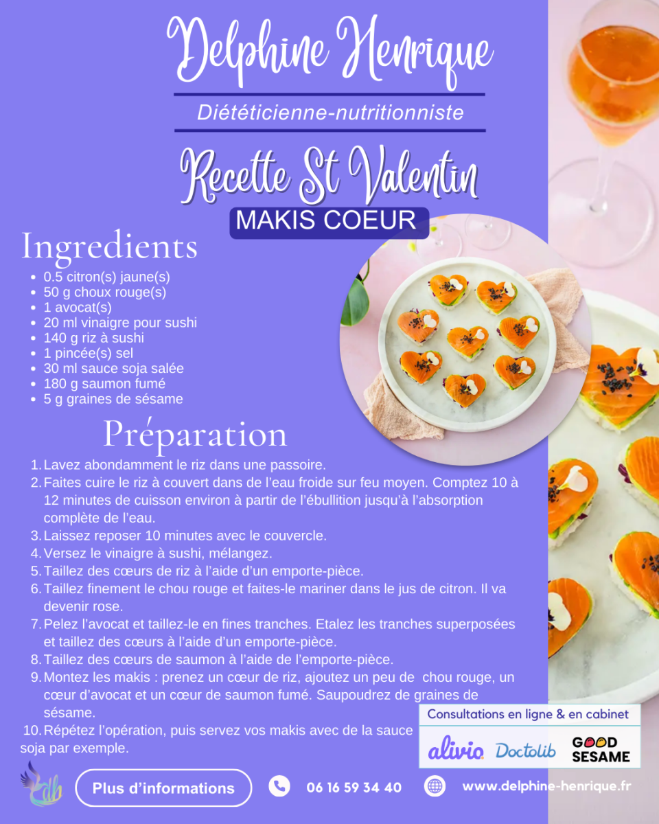 Pour la Saint-Valentin, place à une recette gourmande… sans culpabilité 💕Ces makis en forme de cœur allient plaisir, équilibre et partage.🔎 Valeurs nutritionnelles par portion :651 kcal🥑 Lipides : 31 g🍚 Glucides : 64 g🍗 Protéines : 29 gParce que manger équilibré, c’est aussi savoir se faire plaisir, même lors des occasions spéciales ✨